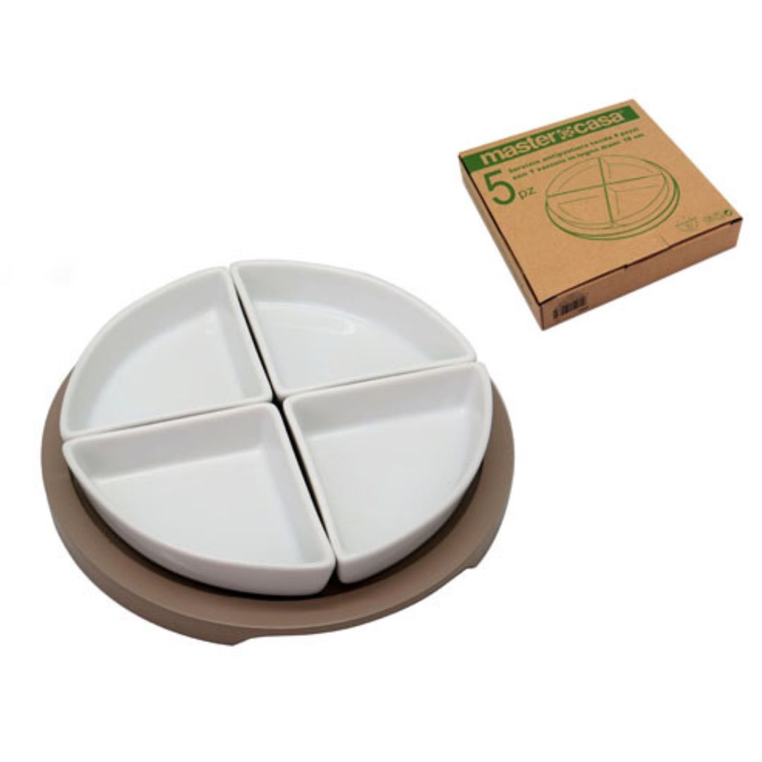 L’antipastiera in porcellana si compone di 4 ciotoline a forma triangolare, unendole creano una forma circolare, che poggiano su un vassoio in legno, perfetta da esporre in tavola per aperitivi o antipasti.