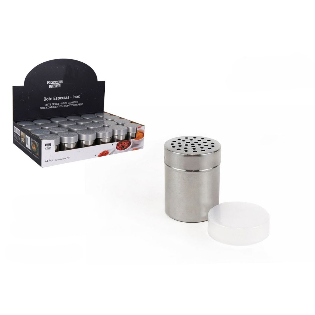 Barattolo realizzato in acciaio per spezie con coperchio forato e tappo in plastica.