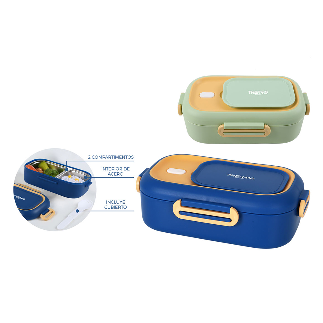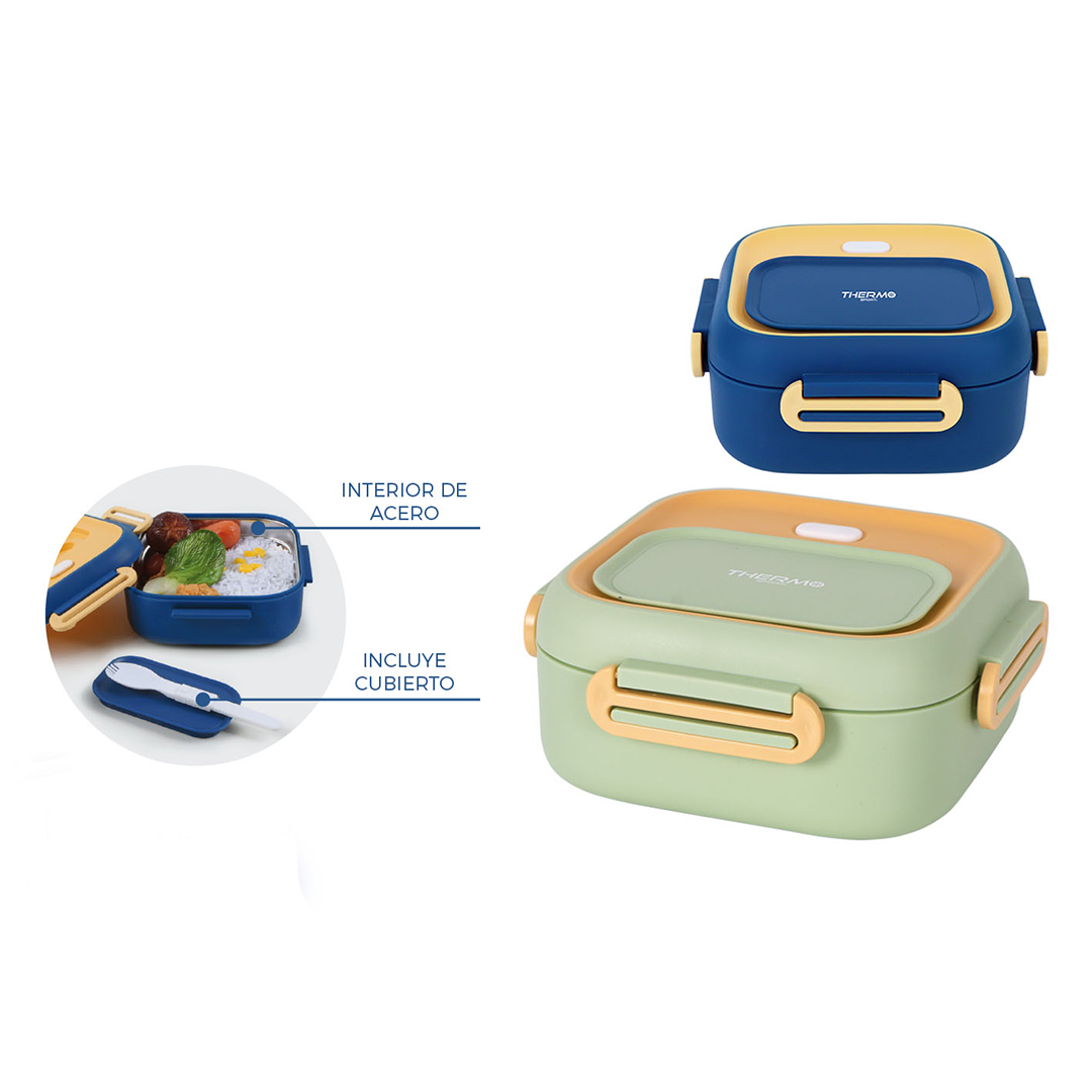 Contenitore Lunchbox che include posata, perfetto per portare con sè il proprio pasto a lavoro, scuola, etc. Realizzato con interno inox rimovibile e chiusura ermtica cuad, permette di non altera i sapori degli alimenti.