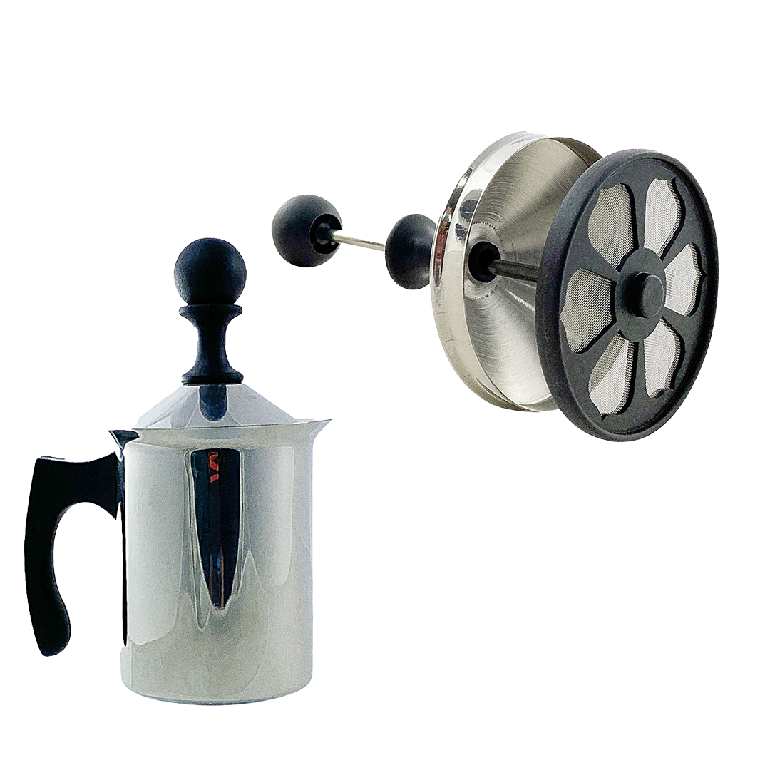 Cappucciera realizzata in acciaio con manico e pomello in bachelite, permette di montare il latte in pochi secondi.