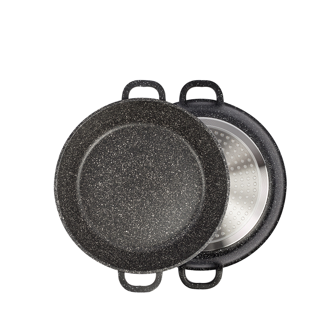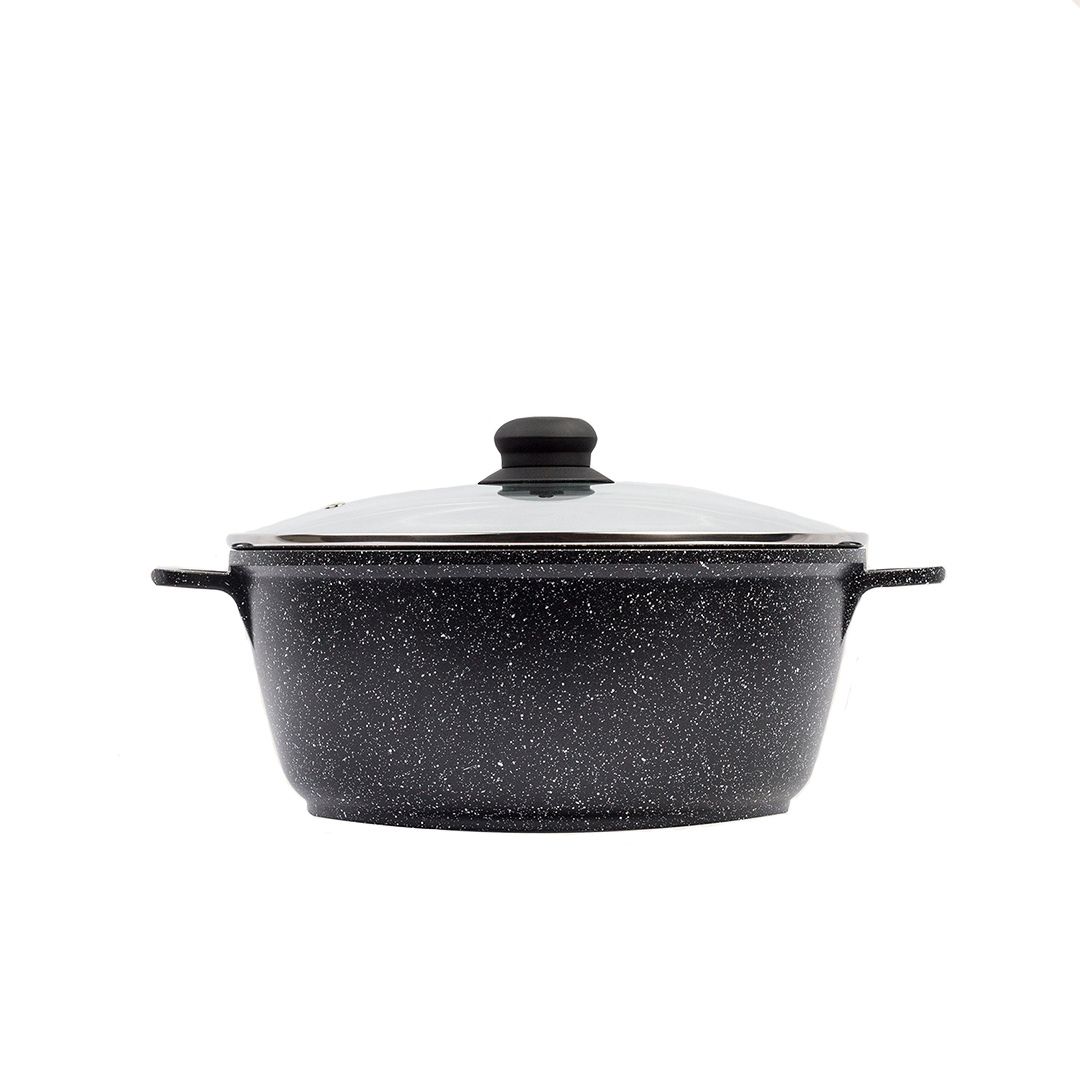 La Casseruola con coperchio Vulcania, in alluminio pressofuso ha il rivestimento antiaderente rinforzato con effetto pietra lavica, il fondo adatto anche per la cottura su piano a induzione.