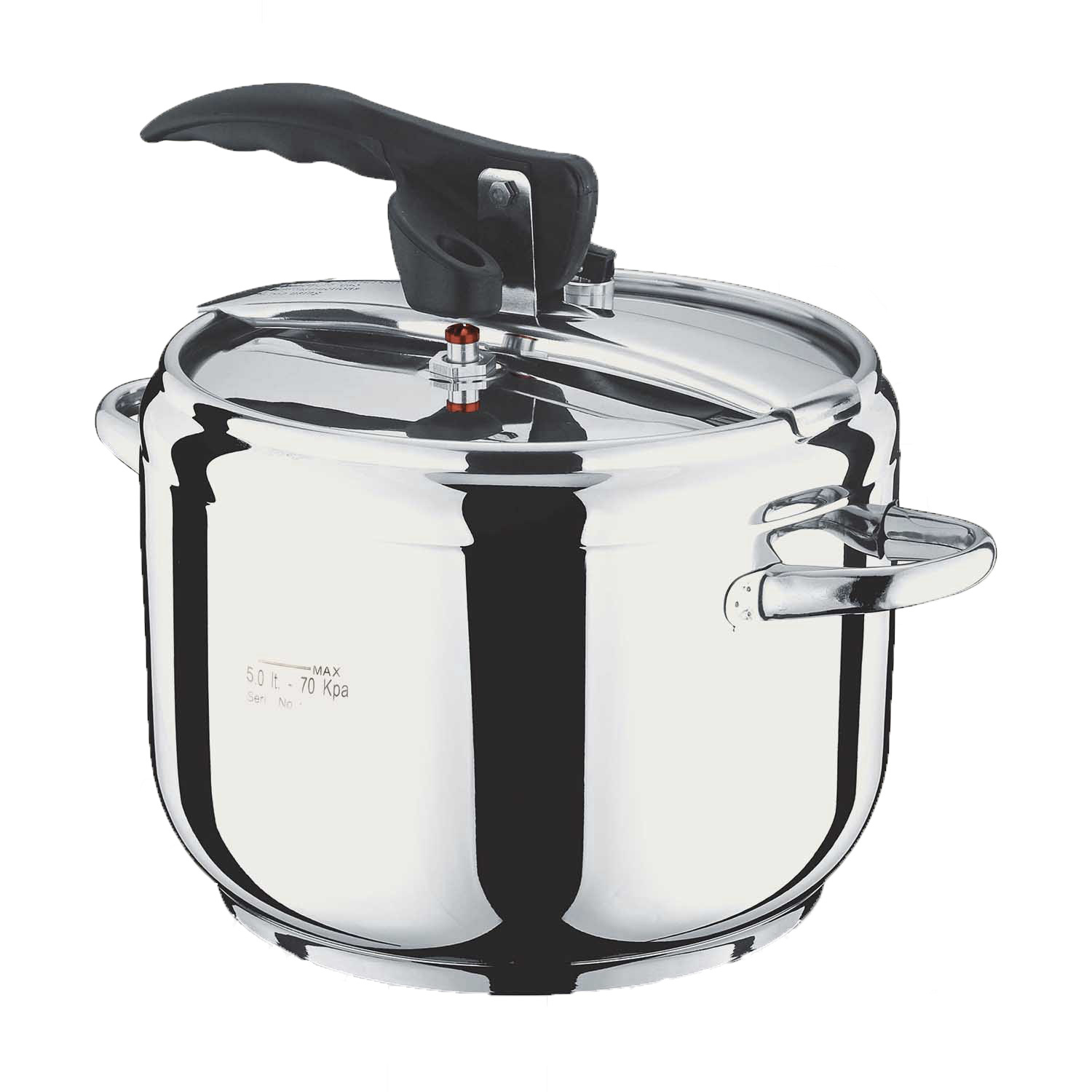 Pentola a pressione in acciaio inox con doppio fondo che rende la pentola adatta all’utilizzo in tutti i pian cottura, anche induzione; Il coperchio con chiusura stagna, dotato di una valvola che blocca l’appertura del coperchio in fase di cottura, una valvola che va azionata per abbassare la pressione della pentola prima di aprire il coperchio; e una terza che si attiva se una delle altre due si otturano.