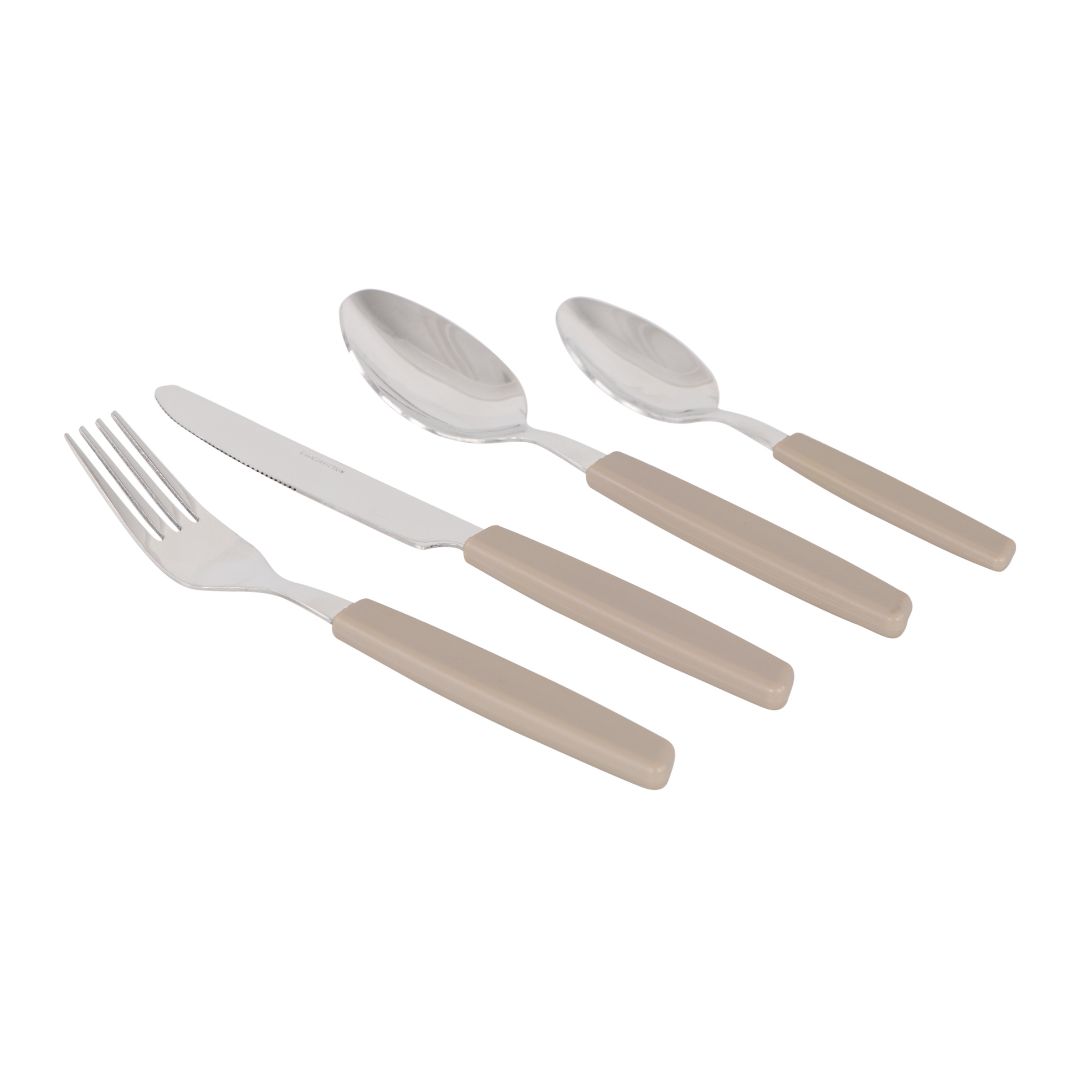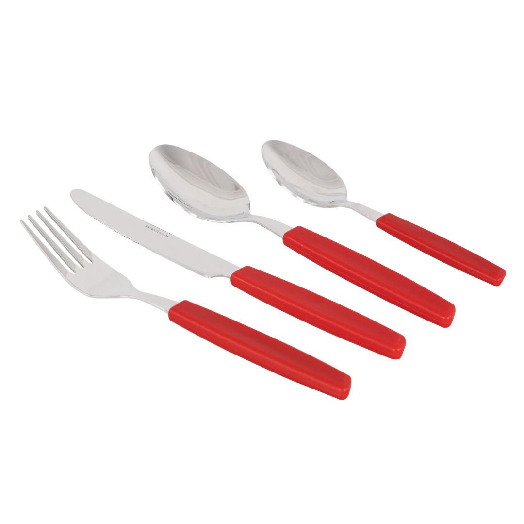 Set di 24 posate in acciaio con manico in plastica, color rosso, sono lavabili in lavastoviglie.